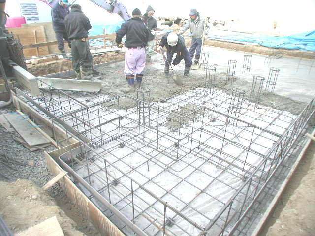 現在建築中のすまいるメゾットの2棟目が基礎工事に入りました。 今日は、将来家を建てたいと思っているお客様に、基礎のコンクリートの中はどのようになっているのかという事を書いてみました。 本や写真、あるいは工事現場を遠目でなんとなく見たことがあるかと思いますが、コンクリートの中には写真で見るような鉄筋が入っています。この鉄筋は、地震などの力が加わったときに引っ張りに強く、コンクリートは圧縮に強いので、これを頑丈な鉄筋コンクリート造といいます。この鉄筋コンクリートの中に正しく配置されている事が、管理上のポイントかと思います。 打ち込みの前は必ず配筋検査を行ないます。当社は、現在べた基礎が主流の為、水の浸入にも注意し、止水板の施工もかなり重要かと思います。