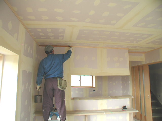 鍛冶屋に建築中のN様邸内部造作工事が終わり、仕上げ工事に入りました。 クロス工事の前に巾木、廻縁等の塗装工事を行ないます。巾木、廻縁に限らず既製品を使う事が多くなってきましたが、当社では社長自ら現場へ行き、細かい色合わせをしながらその家に合った色を決めて行きます。
